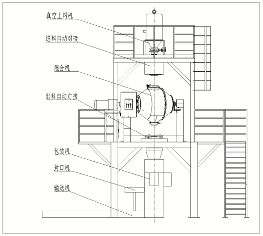 整个生产线为立式结构,此结构占地面积小,流程简单,节约成本。上料由真空上料机对粉料进行提升,整个过程全部实现自动化,混合机进料、出来采用自动对接形式,且保持密闭,实现无尘化,杜绝粉尘飞扬,提供良好生产环境。