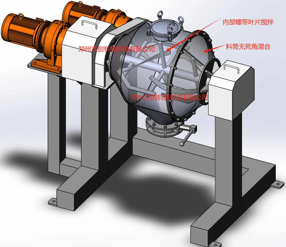 3、料筒360°转动,消除物料死角,叶片搅拌和料筒共同对物料混合,促使物料精细化混合。